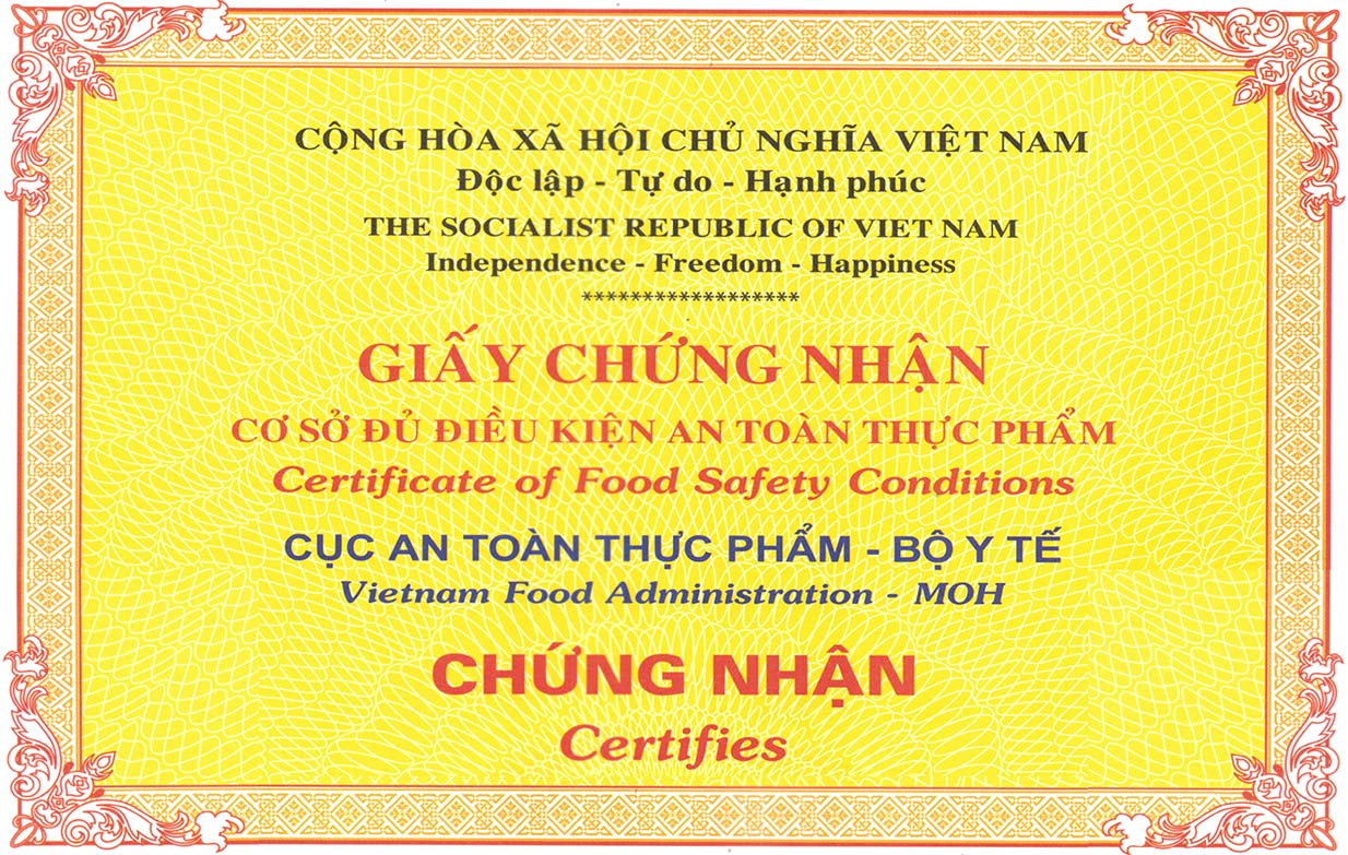 - Nhà hàng và khách sạn đã có một trong các loại chứng chỉ sau: ISO 22000; GMP; IFS; BRC; FSSC 22000; HACCP; hoặc các chứng chỉ tương đương khác.